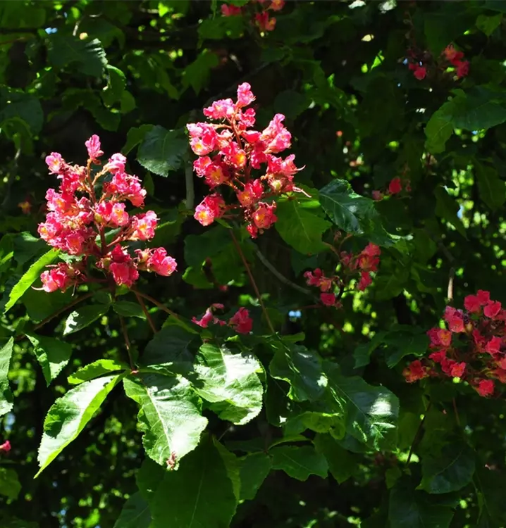Die Scharlachkastanie 'Briotii' (Aesculus carnea) ist ein breiter, rundlicher Baum, der blutrote Blüten hervorbringt. Sie erscheinen im Mitte Mai. Zudem trägt die Scharlachkastanie 'Briotii', handförmige, dunkelgrüne Blätter. An einem sonnigen bis halbschattigen Standort mit durchlässigem, kalkhaltigem, nährstoffreichem, lehmigem Boden erreicht sie gewöhnlich eine Höhe von ca. 15 m und wird ca. 12 m breit.