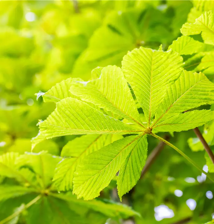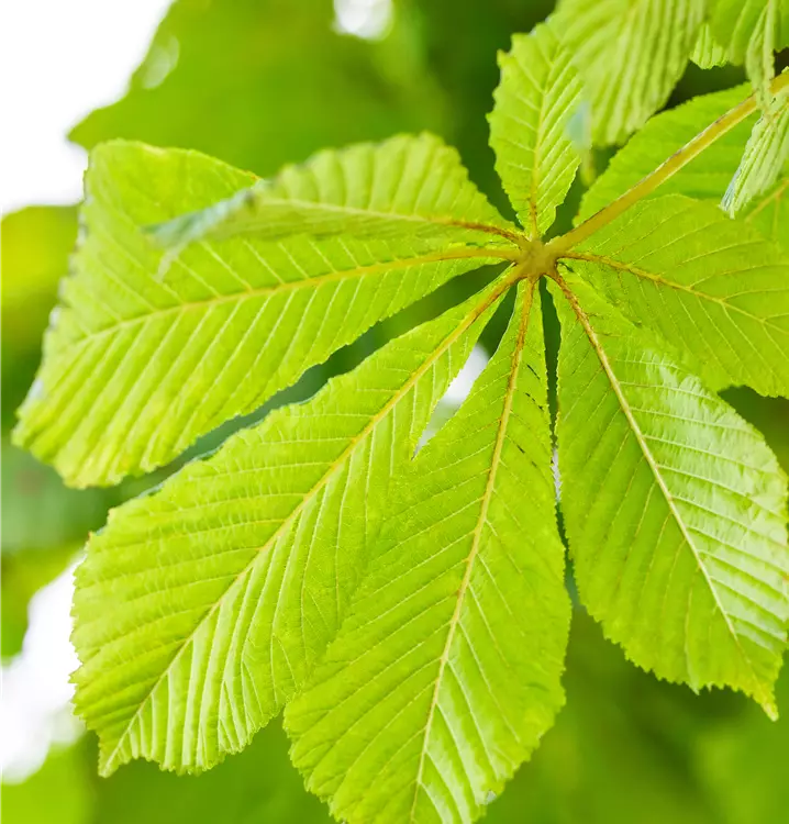Die sommergrünen Blätter der Gefülltblühende Rosskastanie 'Baumannii' sind dunkelgrün, handförmig, gegenständig. Diese sind etwa 10 - 20 cm groß. Gefülltblühende Rosskastanie 'Baumannii' zeigt sich leuchtend gelb im Herbst.