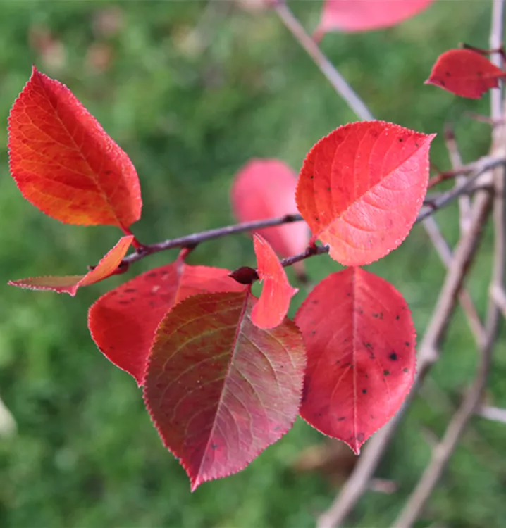 Die sommergrünen Blätter der Apfelbeere 'Viking' sind mittelgrün, eiförmig, wechselständig. Diese sind etwa 2 - 5 cm groß. Apfelbeere 'Viking' zeigt sich leuchtend dunkelrot im Herbst.