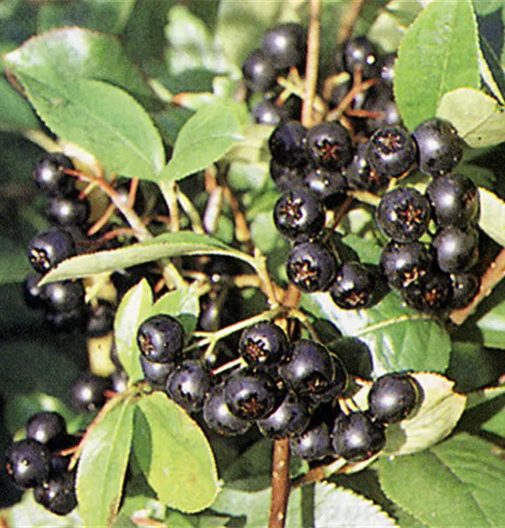 Die Apfelbeere 'Viking' (Aronia melanocarpa) bildet schwarze Früchte. Sie sind rund und haben einen süß-säuerlichen Geschmack. Für eine ertragreiche Ernte ab August schaffen durchlässiger, humoser, nährstoffreicher, anspruchsloser Boden und ein sonniger bis halbschattiger Standort optimale Bedingungen. Ihre weißen Blüten sind eine schöne Erscheinung. Die Apfelbeere 'Viking' wird mit ihrem aufrechten, ausläuferbildenden und mehrstämmigen Wuchs etwa 1,5 m hoch und 1,2 m breit.