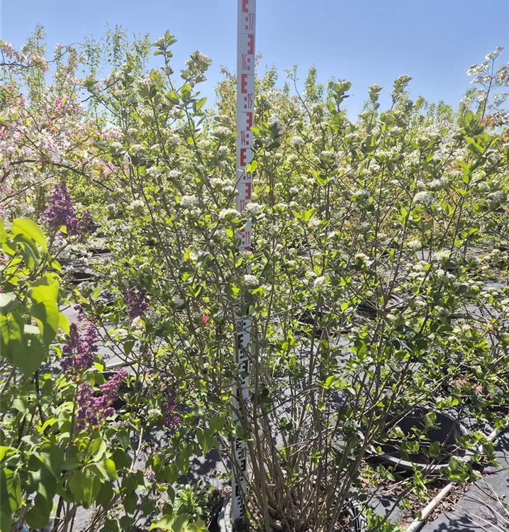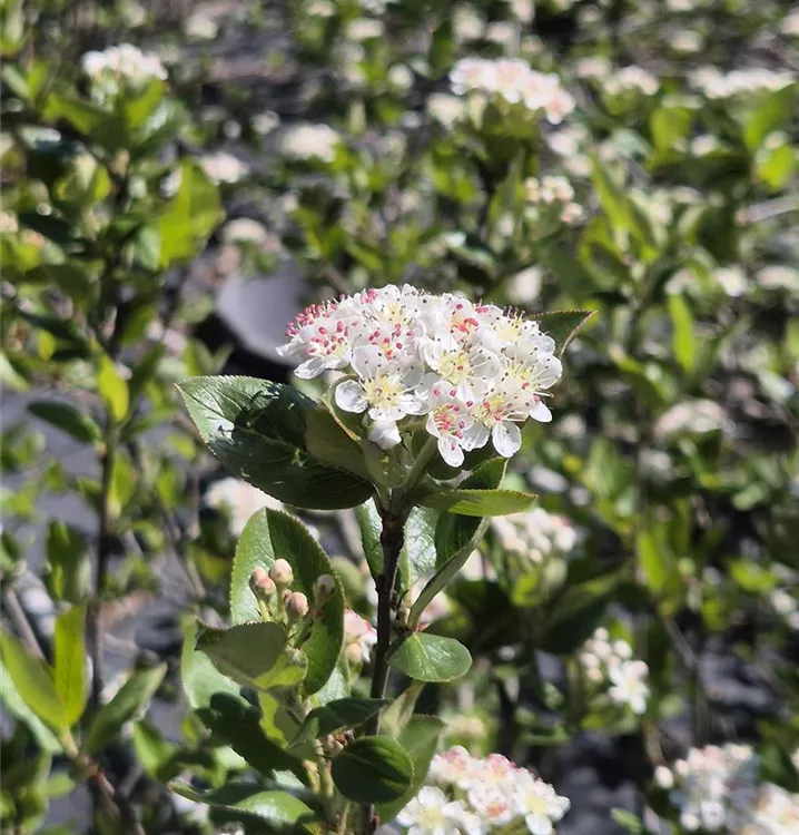 Aronia melanocarpa 'Viking' bildet in Rispen angeordnete, weiße Blüten ab Mai.