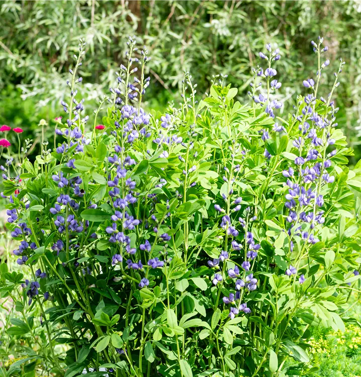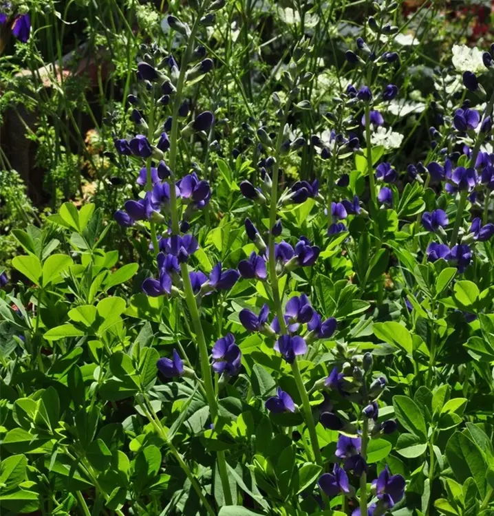 Die Blaue Färberhülse (Baptisia australis) ist eine buschige, aufrechte Staude mit dekorativen, lanzettlichen, grau-grünen Blättern. Von Juli bis August trägt sie blauviolette, schmetterlingsförmige, in Dolden angeordnete Blüten. An einem sonnigen Standort mit durchlässigem, nährstoffreichem, sandigem Boden erreicht sie gewöhnlich eine Höhe von ca. 1 m und wird ca. 80 cm breit. Die Blaue Färberhülse ist gut frostverträglich.