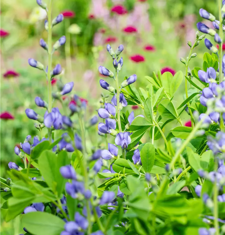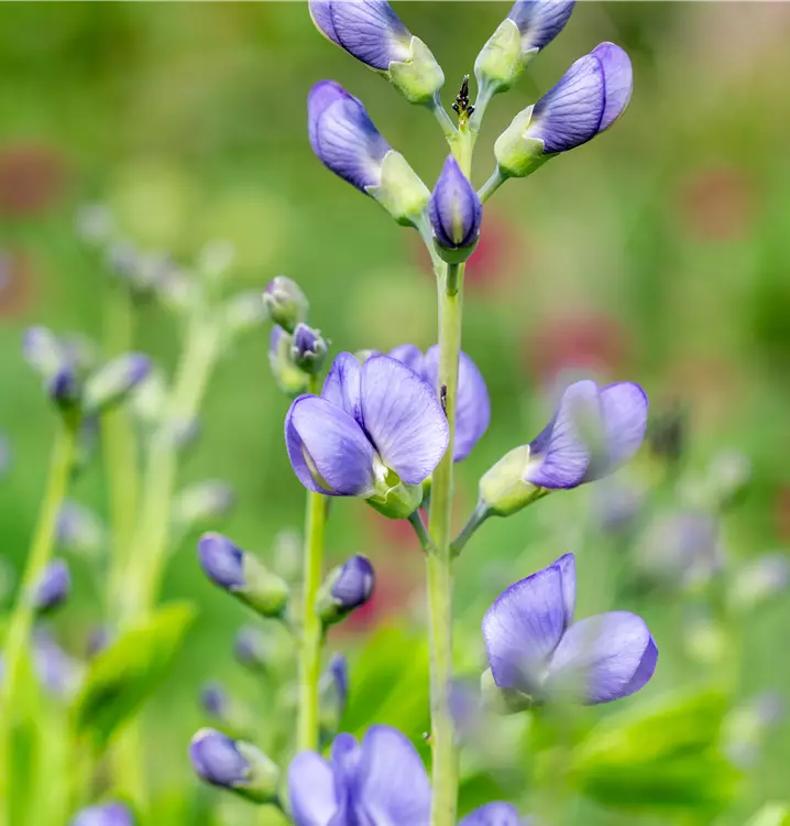 Baptisia australis bildet schmetterlingsförmige, in Dolden angeordnete, blauviolette Blüten ab Juli.