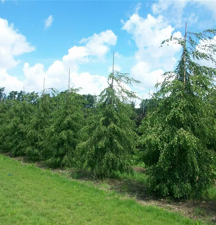 Trauerbirke 'Youngii' ist ein schirmförmig wachsender Kleinbaum mit lockerer Krone. Sie erreicht gewöhnlich eine Höhe von 4 - 8 m und wird ca. 4 - 8 m breit. Langsam wachsend. In der Regel wächst sie 20 - 30 cm pro Jahr.