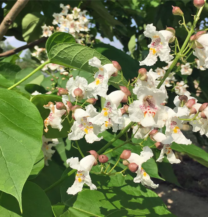 Die weißen Blüten des Trompetenbaum erscheinen in Rispen von Juni bis Juli.