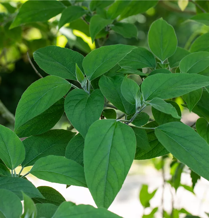 Die sommergrünen Blätter des Harlekin-Losbaums sind hellgrün, eiförmig, glänzend, gegenständig. Diese sind etwa 8 - 15 cm groß.
