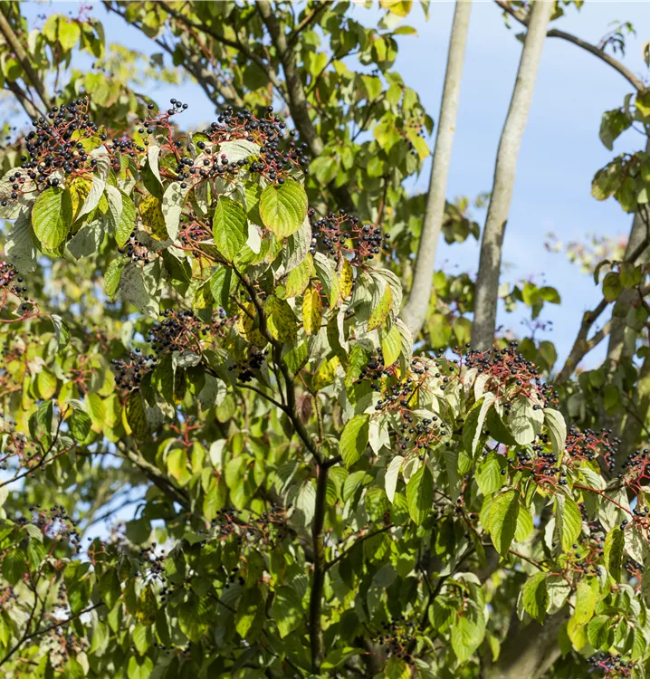 Besonders dekorativ sind die schwarzen, runden Steinfrüchte von Cornus sanguinea. Diese erscheinen ab September.