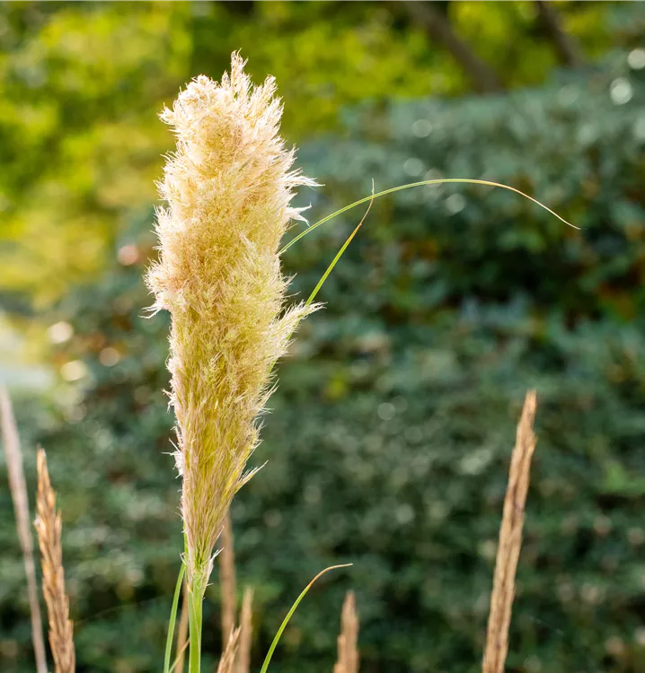 Die silberweißen Blüten des Kleines Garten-Pampasgras 'Pumila' erscheinen in Rispen von September bis Oktober.