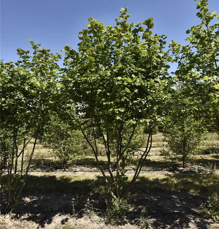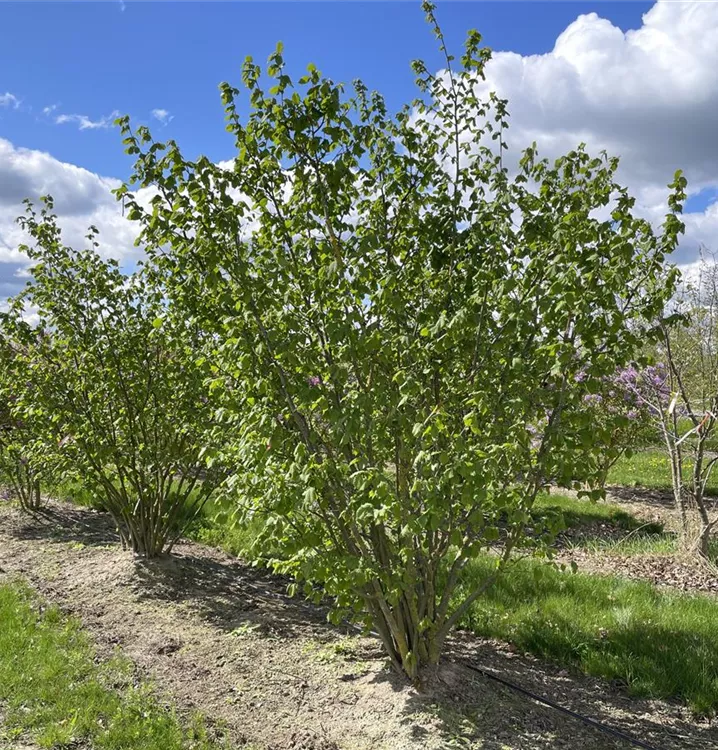 Haselnuss 'Hallesche Riesennuss' ist ein breit und mehrstämmig wachsender Großstrauch. Sie erreicht gewöhnlich eine Höhe von 5 - 7 m und wird ca. 2 - 2,5 m breit. In der Regel wächst sie 20 - 30 cm pro Jahr.