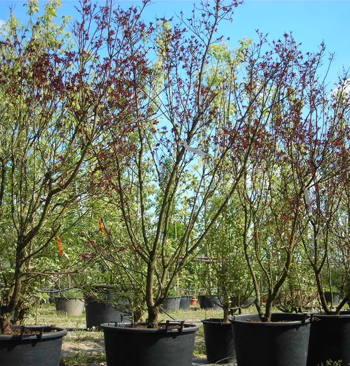 Die rot-braunen Blüten des Roter Perückenstrauch 'Royal Purple' erscheinen in Rispen von Juni bis Juli. Diese werden etwa 15 - 20 cm groß.