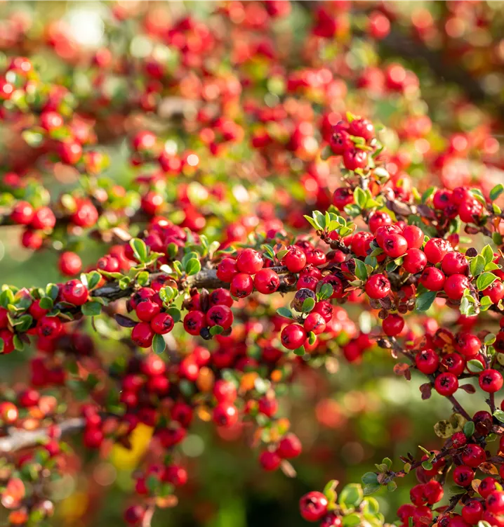 Besonders dekorativ sind die roten, runden Früchte von Cotoneaster horizontalis. Diese erscheinen ab September. Haften sehr lange.