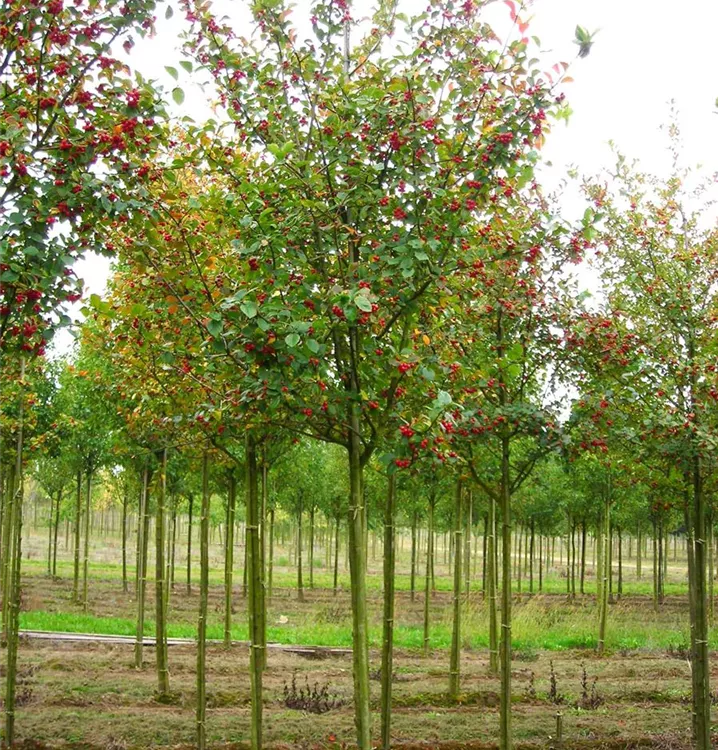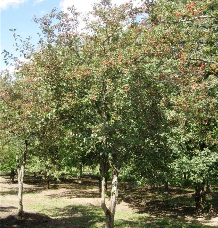Besonders dekorativ sind die dunkelroten, runden Früchte von Crataegus crus-galli. Diese erscheinen ab September. Haften sehr lange.