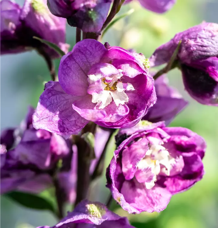 Delphinium pacific 'Astolat' bildet gefüllte, in Rispen angeordnete, altrosafarbene Blüten ab Juni. Bei richtiger Pflege Nachblüte von September bis Oktober.
