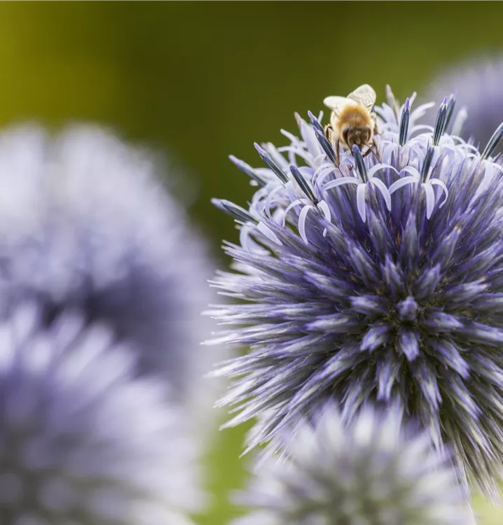 Echinops ritro bildet ballförmige, blau-graue Blüten ab Juli.