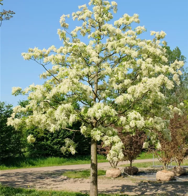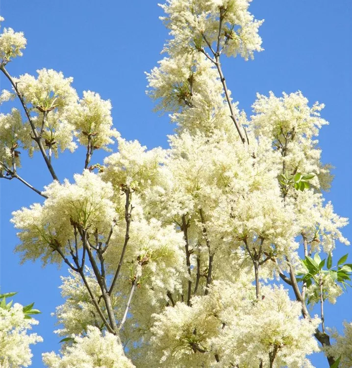 Die cremeweißen Blüten der Blumenesche erscheinen in Rispen von Mai bis Juni. Diese sind angenehm duftend.