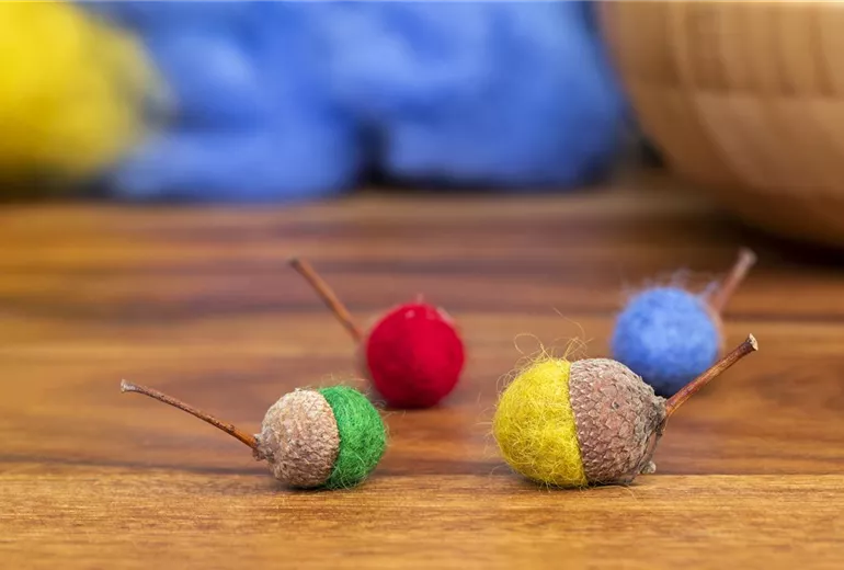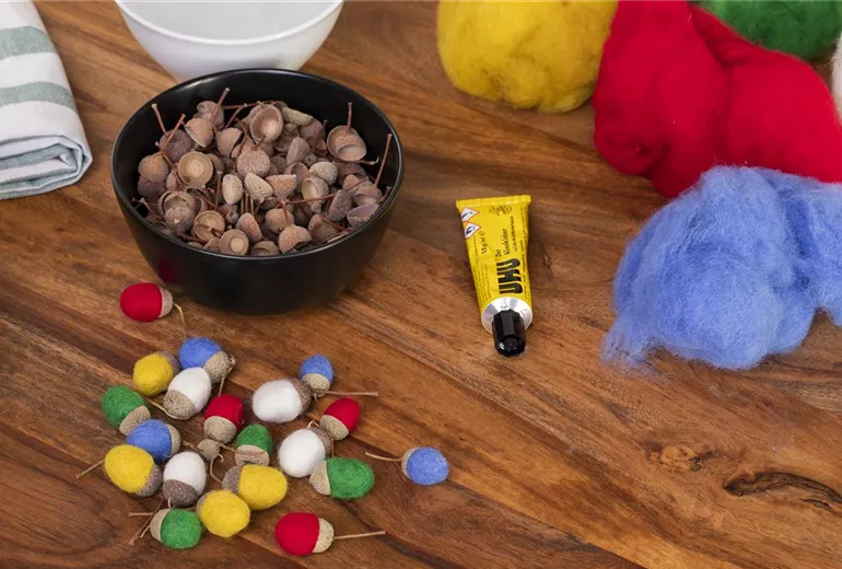 Da die kleinen Filzbälle aber noch nicht wie richtige Eicheln aussehen, fehlt natürlich ein wichtiges Accessoire. Ein Hut darf bei keinem guten Outfit fehlen und deshalb bekommen die kleinen Filzeicheln jetzt noch ein charakteristisches Eichelhütchen. Vorher müssen die Filzeicheln aber noch gut durchtrocknen, damit der Kleber auch hält. Das geht am besten über Nacht und in der Nähe einer Heizung. Und dann geht das Puzzle los. Wer genug Eichelhütchen im Wald gesammelt hat, kann jetzt die richtige Größe raussuchen und die Eichel mit Heißkleber oder Alleskleber in die Eichelhütchen kleben. Die kleinen bunten Filzeicheln machen sich übrigens auch gut an einem Strauch oder als kleine Aufmerksamkeit in einem herbstlichen Geschenk.