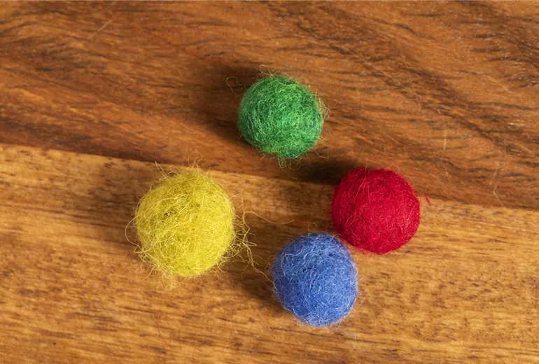 Sind die Schüsseln vorbereitet, kann ein Stück Filzwolle abgezupft werden. Das wird dann in die Schüssel mit dem Seifenwasser getunkt und gut getränkt. Die Filzwolle wieder herausnehmen, auswringen und die Wolle zwischen beiden Handflächen so lange drehen, bis ein kleiner Ball entsteht. Anschließend kann ein neues Stück Filzwolle abgezupft, ins Wasser getaucht und um den kleinen Filzball gelegt werden. Diesen Vorgang so lange wiederholen, bis der Filzball die Größe einer normalen Eichel hat. Die Wolle sollte beim Filzen gut fecht sein, damit die Wollfasern sich gut miteinander verbinden. Wenn die Filzwolle zu trocken ist, können kleine Risse in der Filzeichel entstehen. Die können aber ganz einfach mit einem neuen Stück Filzwolle ummantelt und weggefilzt werden. Ist die Filzeichel fertig gedreht, wird sie in das Essigwasser gelegt, um die Seife auszuspülen.