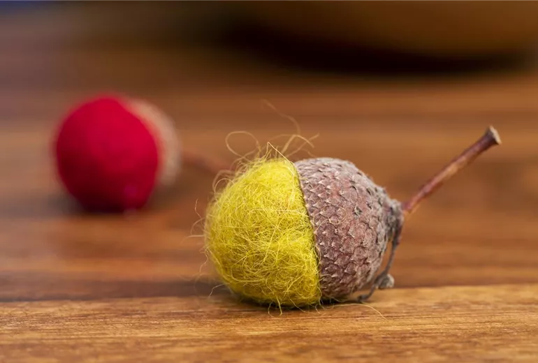 Dekoration im Herbst besteht doch eigentlich immer aus Eicheln, Kastanien und Tannenzapfen. Warum auch nicht, die Dinge sind nämlich bei einem gemütlichen Waldspaziergang schnell gesammelt und sehen einfach toll aus. Aber auch daraus kann man mit ein bisschen Kreativität schöne Herbstdeko basteln, die bisher keiner hat. Alles, was für die bunten Filzeicheln benötigt wird, sind Filzwolle, Eichelhütchen, Seife, Essig und Heißkleber. Damit aus der Filzwolle kleine Eicheln werden, müssen aber erst einmal einige Vorbereitungen getroffen werden. Zwei Schüsseln werden mit handwarmen Wasser gefüllt. In eine der Schüsseln wird dann etwas Seife gehobelt. Am besten eignet sich Seife mit einem Olivenöl-Anteil. Normale Seife geht aber natürlich auch. In die andere Schüssel kommt ein Schuss Essig.