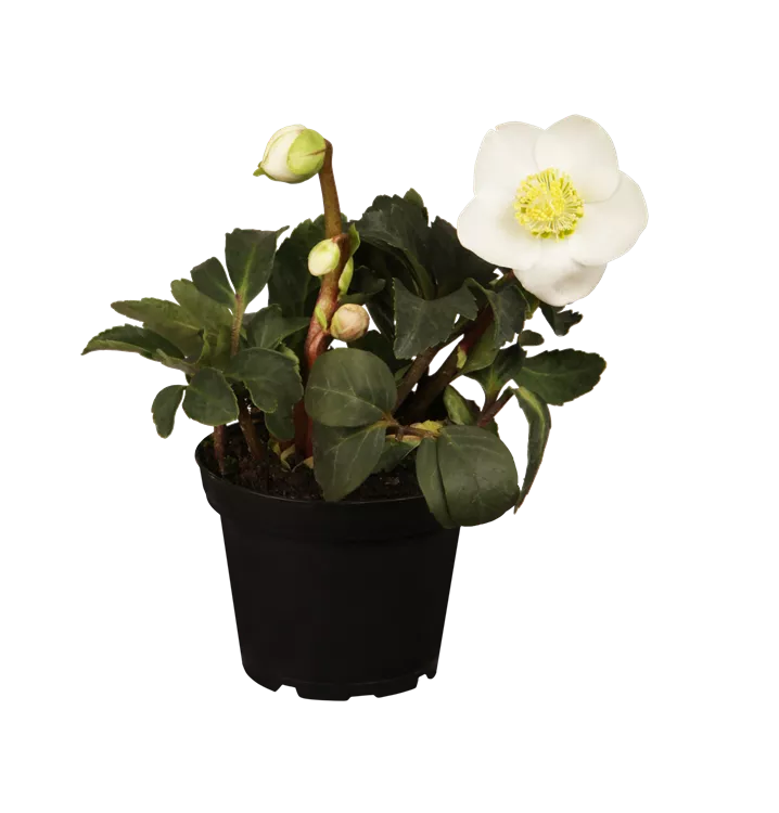 Die Christrose (Helleborus niger) ist eine aufrechte, wintergrüne Staude, die von Dezember bis März weiße, schalenförmige Blüten bildet. Ihre lanzettlichen Blätter sind dunkelgrün. An einem halbschattigen bis schattigen Standort mit kalkhaltigem, lehmigem Boden erreicht sie gewöhnlich eine Höhe von ca. 20 cm und wird ca. 30 cm breit. Die Christrose ist gut frostverträglich.