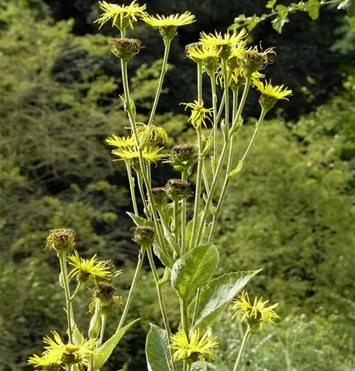 Inula helenium bildet strahlenförmige, gelbe Blüten ab Juli.