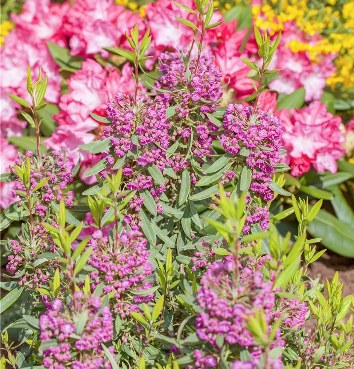 Das Rotes Lorbeerröslein 'Rubra' (Kalmia angustifolia) ist ein aufrechter, buschiger, breiter Kleinstrauch, der purpurrote, schalenförmige Blüten hervorbringt. Sie erscheinen von Juni bis Juli. Aus diesen gehen braune Kapseln hervor. Zudem trägt das Rotes Lorbeerröslein 'Rubra', lanzettliche, dunkelgrüne Blätter. An einem sonnigen bis halbschattigen Standort mit humosem, kalkfreiem, saurem Boden erreicht es gewöhnlich eine Höhe von ca. 1 m und wird ca. 1,2 m breit.