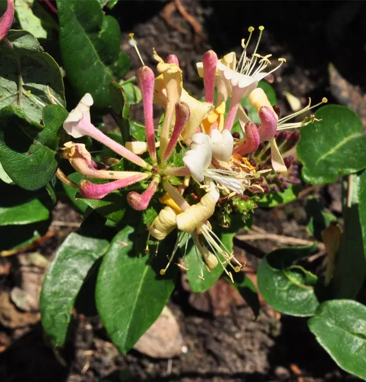 Besonders dekorativ sind die dunkelroten, runden Früchte von Lonicera periclymenum. Diese erscheinen ab August.