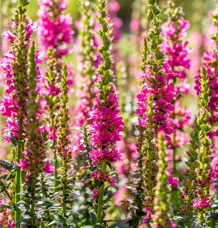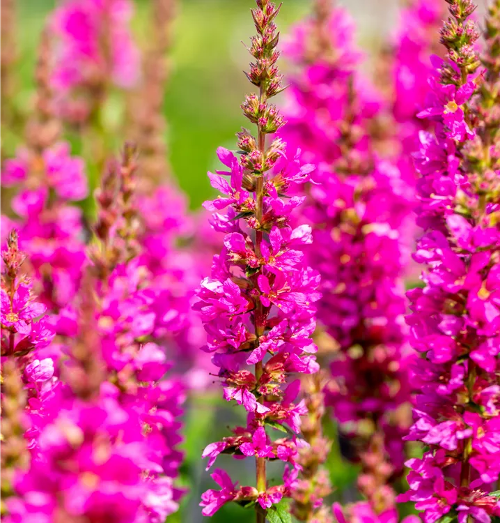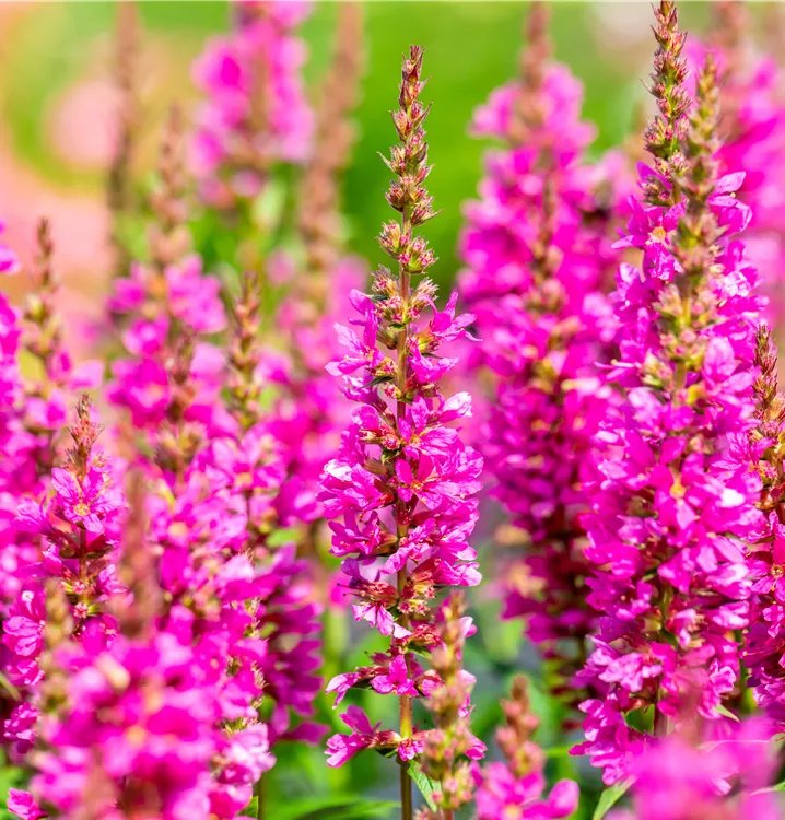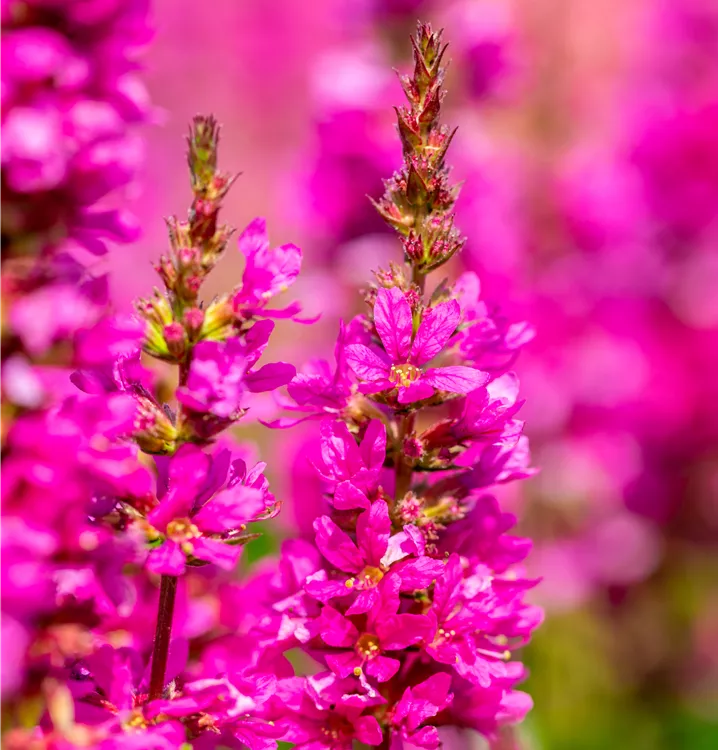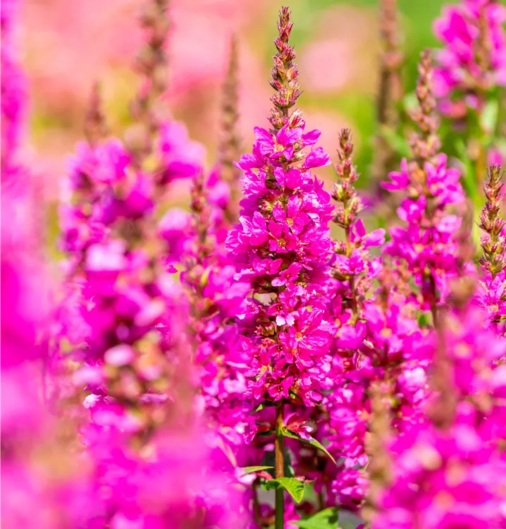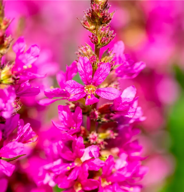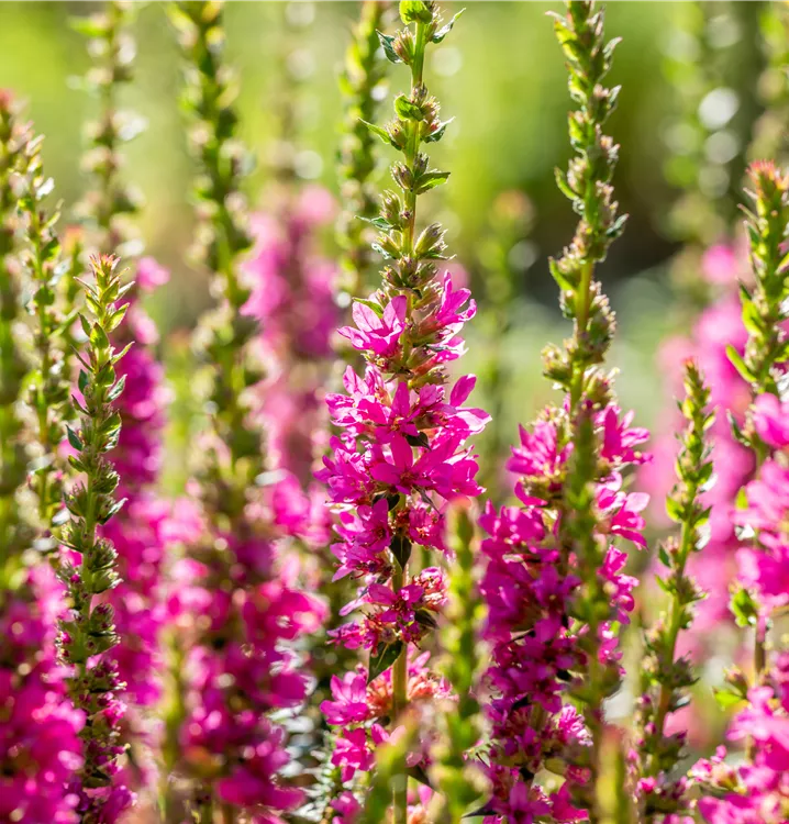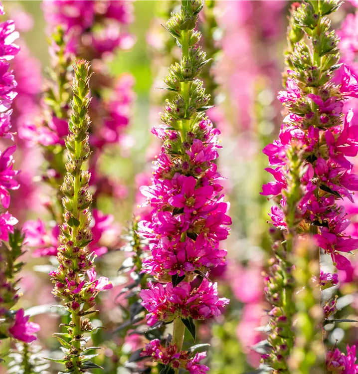 Lythrum salicaria 'Robert' bildet in Quirle angeordnete, karminrote Blüten ab Juli. Diese verströmen einen angenehmen Duft.