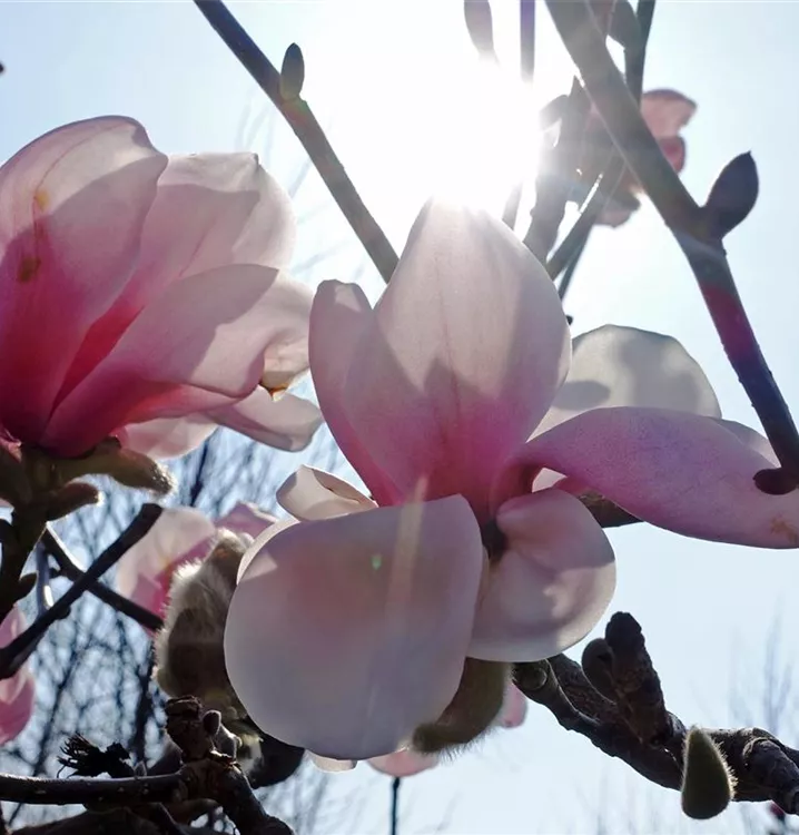 Das auffälligste Merkmal der Tulpen-Magnolie sind ihre großen, kelchförmigen Blüten, oft 10-20 cm im Durchmesser. Sie blühen typischerweise dramatisch an kahlen Ästen im zeitigen Frühjahr (Ende März bis Mitte April in gemäßigten Klimazonen), bevor die Blätter erscheinen. Die Blütenfarben variieren stark zwischen den Sorten, von reinem Weiß bis zu verschiedenen Rosa-, Lila- und sogar Kastanienbrauntönen, oft mit einem zweifarbigen Effekt (dunkler außen, heller innen). Einige Sorten sind auch duftend.