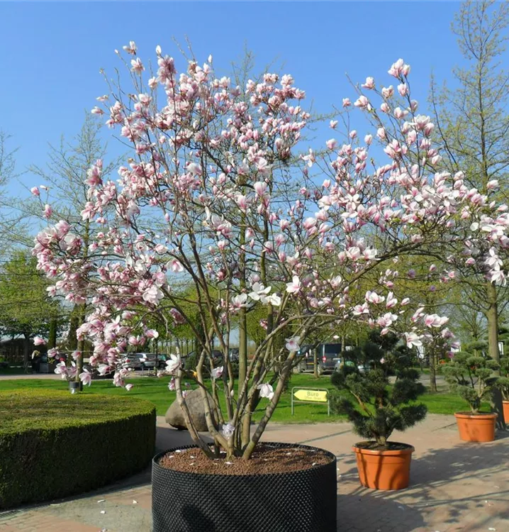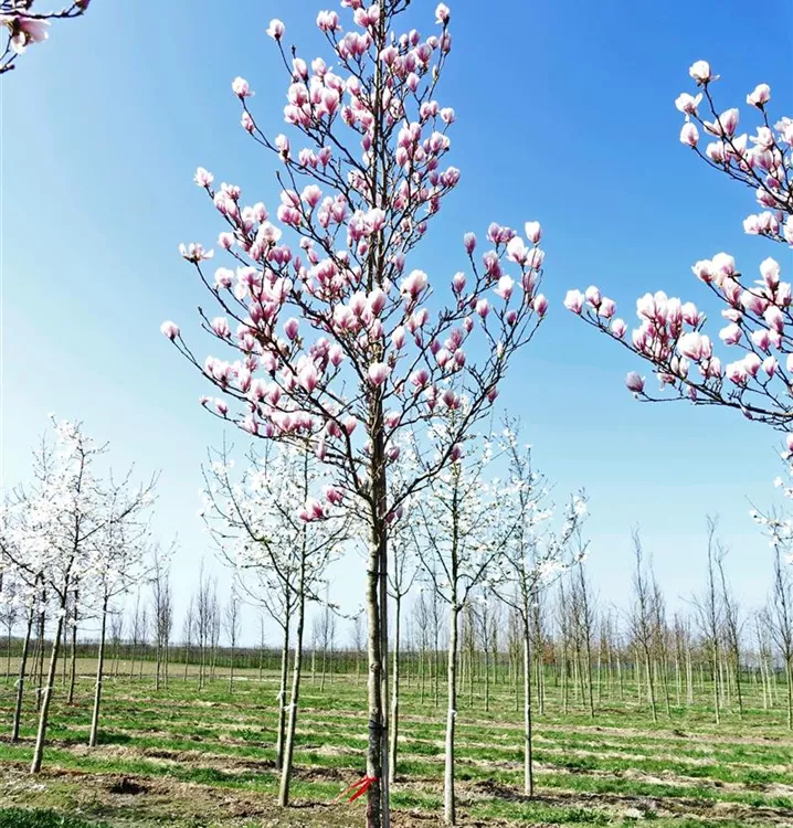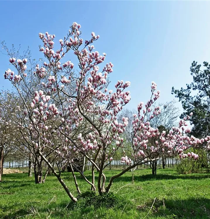 Die Tulpen-Magnolie (Magnolia x soulangeana) ist einer der beliebtesten und am weitesten verbreiteten laubabwerfenden Magnoliensträucher oder -bäume. Sie wird für ihre spektakuläre Pracht an großen, kelch- bis schalenförmigen Blüten im zeitigen Frühjahr geschätzt, oft bevor ihre Blätter erscheinen. Diese Hybrid-Magnolie ist das Ergebnis einer Kreuzung zwischen Magnolia denudata und Magnolia liliiflora, die erstmals um 1826 in Frankreich gezüchtet wurde. Sie ist eine klassische Wahl, um der Landschaft eine elegante, dramatische Note zu verleihen.