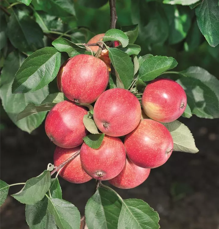 Der Apfel 'Resi'(s) (Malus domestica) bildet rote Früchte. Sie haben einen süß-säuerlichen Geschmack. Für eine ertragreiche Ernte ab September schaffen durchlässiger, nährstoffreicher Boden und ein sonniger bis halbschattiger Standort optimale Bedingungen. Seine hellrosafarbenen Blüten sind eine schöne Erscheinung. Der Apfel 'Resi'(s) wird mit seinem aufrechten und breiten Wuchs etwa 4 m hoch und 3 m breit.