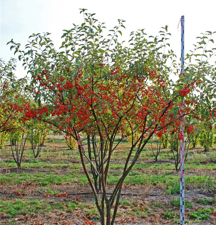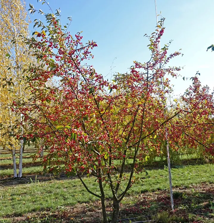 Besonders dekorativ sind die roten, runden Früchte von Malus x moerlandsii 'Red Sentinel'. Diese erscheinen ab September und sind klein. Haften sehr lange.