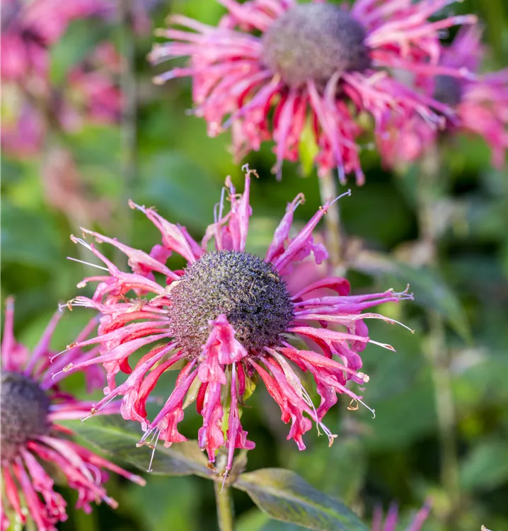 Monarda fistulosa 'Beauty of Cobham' bildet lippenförmige, in Quirle angeordnete, magentafarbene Blüten ab Juli.