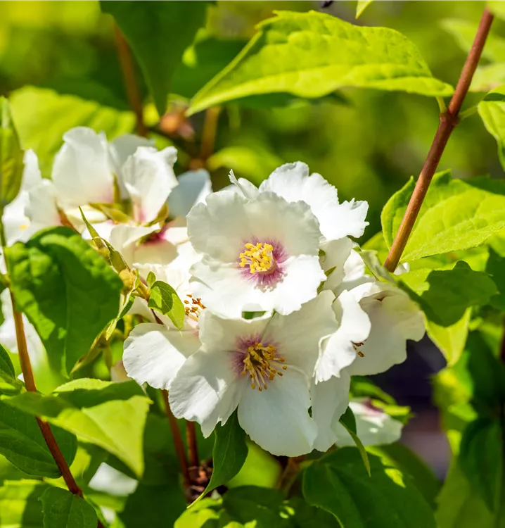 Der Gartenjasmin 'Belle Etoile' (Philadelphus) ist ein aufrechter, gedrungener Kleinstrauch, der weiße, schalenförmige Blüten mit einem starken Duft hervorbringt. Sie erscheinen von Juni bis Juli. Zudem trägt der Gartenjasmin 'Belle Etoile', eiförmige, mittelgrüne Blätter. An einem sonnigen bis halbschattigen Standort erreicht er gewöhnlich eine Höhe von ca. 1,5 m und wird ca. 1,5 m breit. An den Boden stellt der Gartenjasmin 'Belle Etoile' keine besonderen Ansprüche.