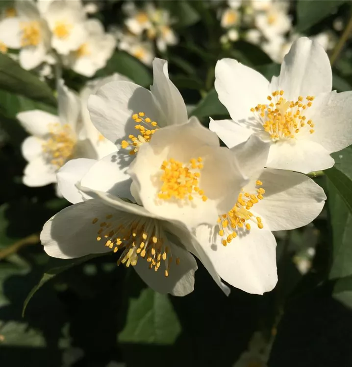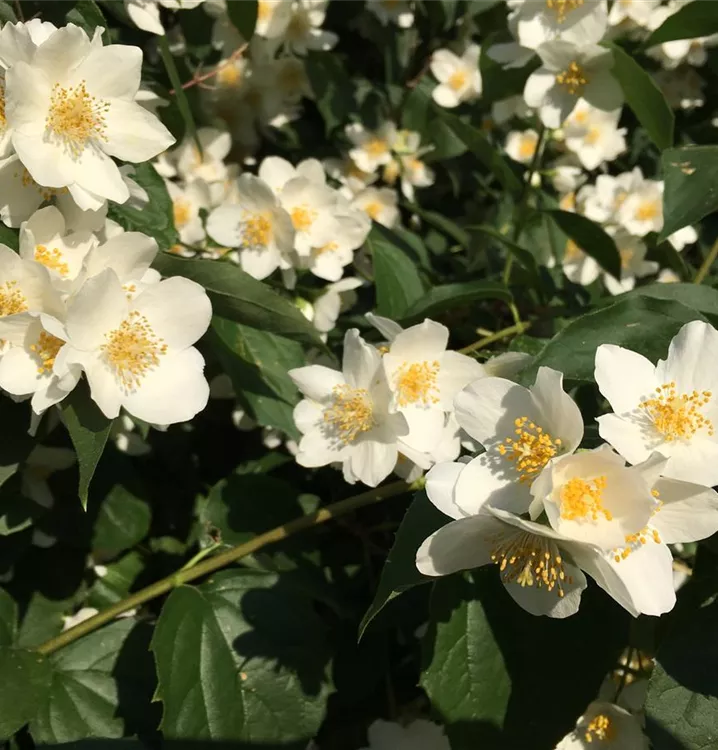 Der Großblumiger Feldjasmin (Philadelphus inodorus grandiflorus) ist ein aufrechter, lockerer, malerischer Großstrauch, der weiße, in Trauben angeordnete Blüten hervorbringt. Sie erscheinen von Juni bis Juli. Zudem trägt der Großblumiger Feldjasmin, eiförmige, dunkelgrüne Blätter. Seine Rinde ist braun, abblätternd. An einem sonnigen bis halbschattigen Standort mit durchlässigem, feuchtem bis nassem Boden erreicht er gewöhnlich eine Höhe von ca. 4 m und wird ca. 3 m breit.