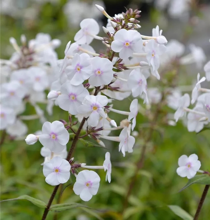 Phlox carolina 'Omega' bildet radförmige, in Dolden angeordnete, weiß-rote Blüten ab Juli. Diese verströmen einen angenehmen Duft.