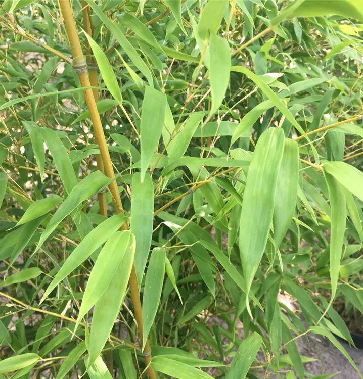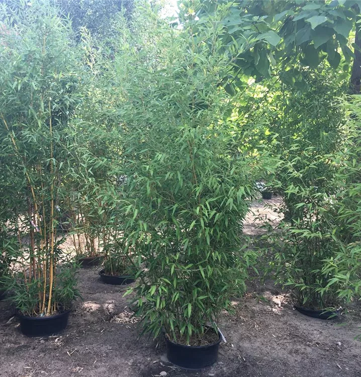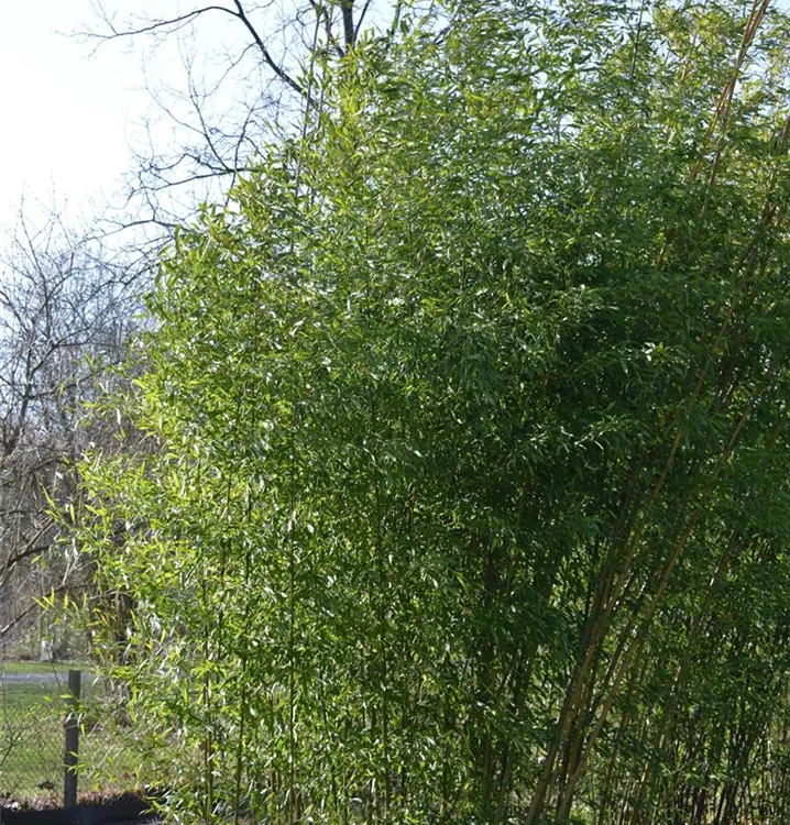 Schwarzrohrbambus 'Henonis' ist ein trichterförmig wachsender Großstrauch, der eine Höhe von 4 - 6 m und eine Breite von 1,5 - 2,5 m erreichen kann.