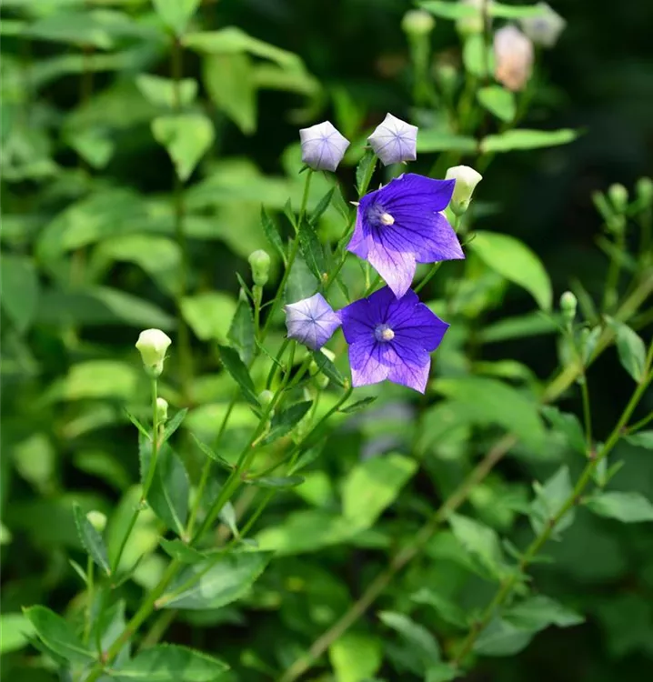 Platycodon grandiflorus 'Mariesii' bildet glockenförmige, blaue Blüten ab Juli.