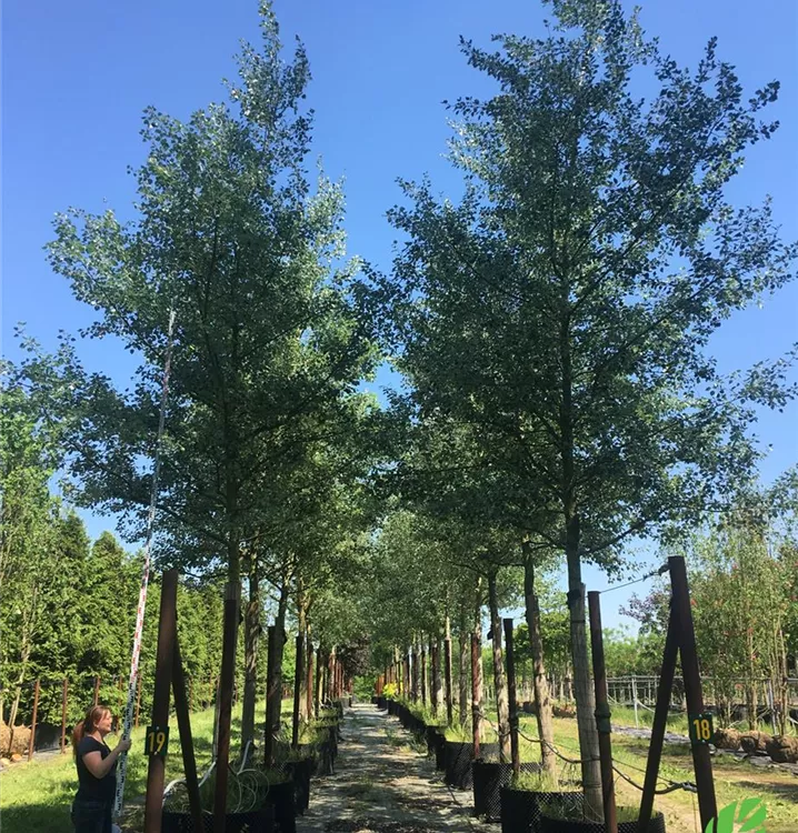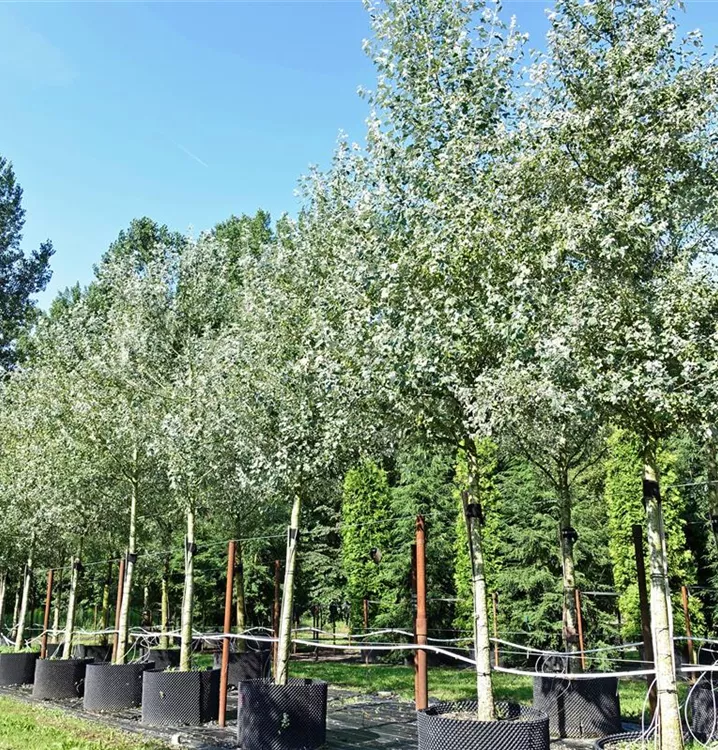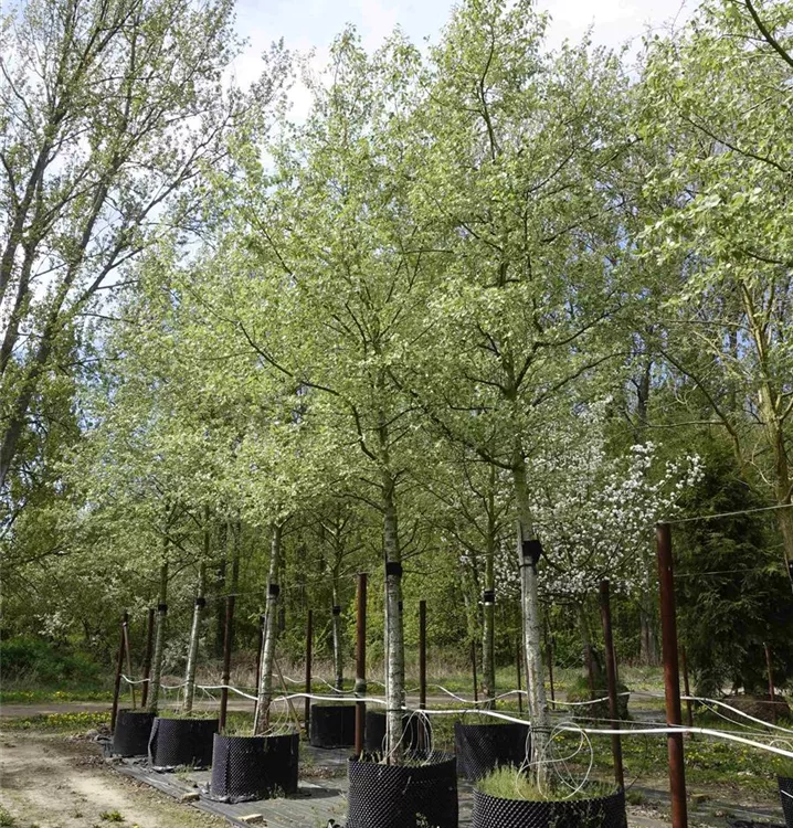 Silberpappel 'Nivea' ist ein breit und rundlich wachsender Großbaum mit lockerer Krone. Sie erreicht gewöhnlich eine Höhe von 20 - 35 m und wird ca. 15 - 18 m breit. Rasch wachsend. In der Regel wächst sie 50 - 60 cm pro Jahr.