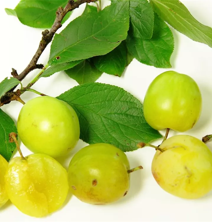Die Reneklode 'Oullins Reneklode' (Prunus domestica) bildet gelbe, große, mittelfeste und saftige Früchte. Sie sind rund und haben einen süßen, würzigen Geschmack. Für eine ertragreiche Ernte ab Ende Juli schaffen durchlässiger, humoser, nährstoffreicher Boden und ein sonniger Standort optimale Bedingungen. Ihre weißen Blüten sind eine schöne Erscheinung. Die Reneklode 'Oullins Reneklode' wird mit ihrem aufrechten Wuchs etwa 10 m hoch und 6 m breit.