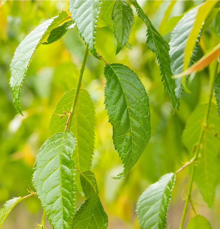 Besonders dekorativ sind die, ovalen, runden Steinfrüchte von Prunus serrulata 'Kiku-shidare-zakura'.