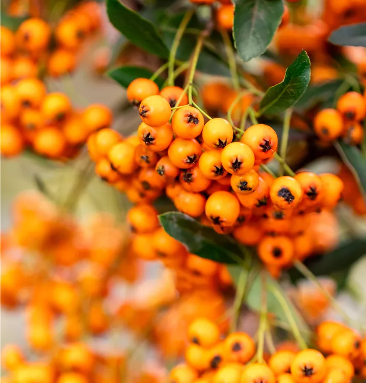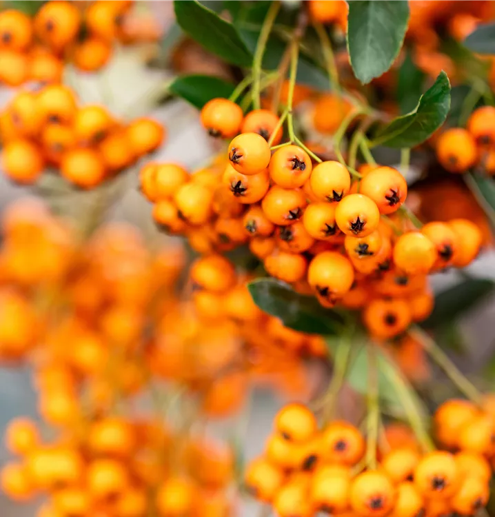 Besonders dekorativ sind die orangefarbenen, runden Früchte von Pyracantha 'Orange Charmer'. Diese erscheinen ab September. Haften sehr lange.