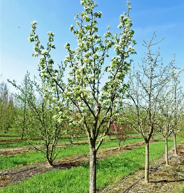 Pyrus communis 'Gellerts Butterbirne' bildet in Doldentrauben angeordnete, weiße Blüten ab April.