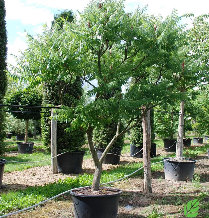 Der Farnwedel-Essigbaum 'Dissecta' (Rhus typhina) ist ein gedrungener, malerischer Strauch mit dekorativen, roten Früchten, die sehr lange haften. Diesen voraus bringt er von Juni bis Juli hellgrüne, in Rispen angeordnete Blüten hervor. Zudem trägt der Farnwedel-Essigbaum 'Dissecta', glänzende, gefiederte, mittelgrüne Blätter. An einem sonnigen Standort erreicht er gewöhnlich eine Höhe von ca. 4 m und wird ca. 8 m breit. An den Boden stellt der Farnwedel-Essigbaum 'Dissecta' keine besonderen Ansprüche.