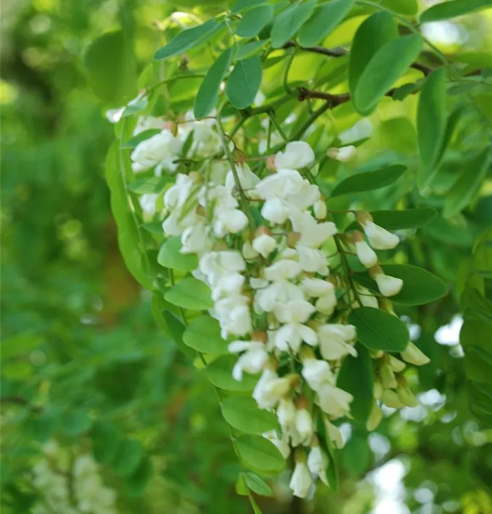 Die weißen Blüten der Korkenzieher-Scheinakazie 'Tortuosa' erscheinen in Trauben von Ende Mai bis Anfang Juni. Diese sind stark duftend.