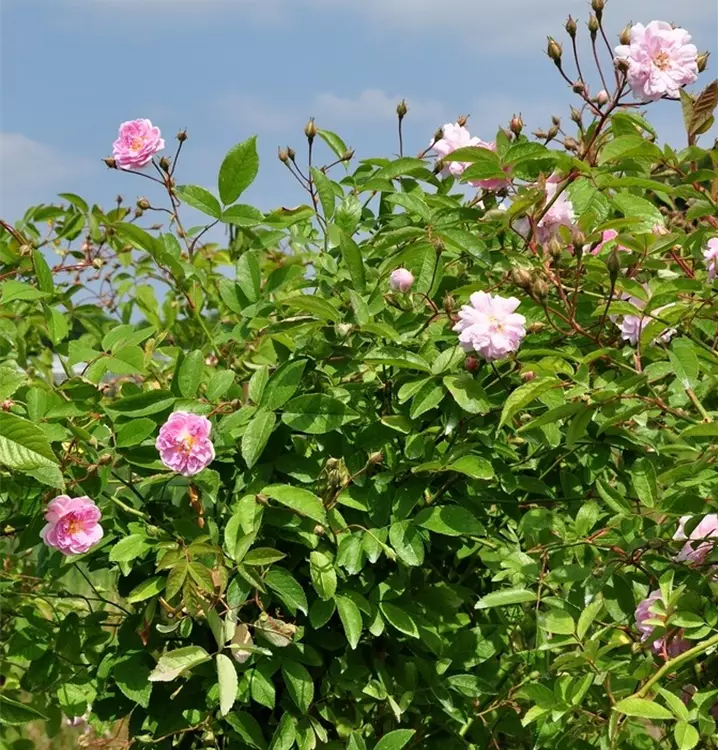 Die Kletterrose 'Paul's Himalayan Musk Rambler' (Rosa) ist eine reichblühende Rose, die im Garten eine besondere Rolle spielt. Die zahlreichen halbgefüllten Blüten sind lilarosa und erscheinen von Juni bis Oktober. Ihr wunderbarer Duft entfaltet sich besonders an sonnigen, warmen Tagen. Mit dem kletternden Wuchs wird dieses Gehölz bis zu 4 m hoch und 2 m breit.