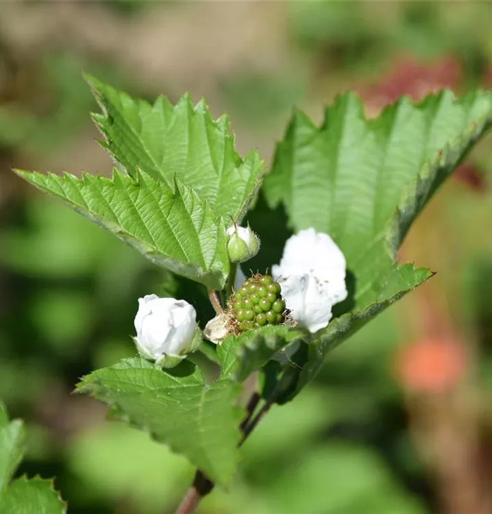 Die weißen, schalenförmigen Blüten der Brombeere 'Loch Ness'(s) erscheinen in Doldentrauben von Juni bis Juli.