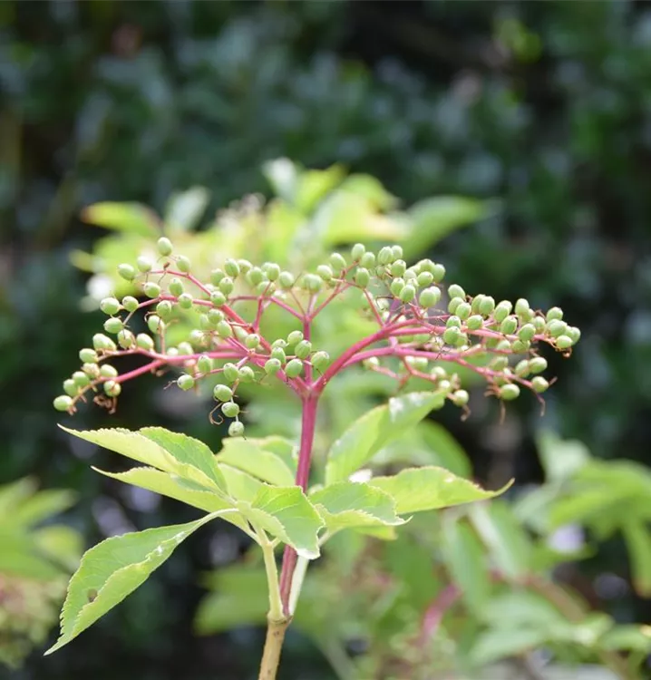 Die sommergrünen Blätter des Schwarzer Holunder 'Haschberg's sind dunkelgrün, gefiedert, gegenständig. Schwarzer Holunder 'Haschberg' zeigt sich leuchtend gelb im Herbst. Lange haftend.