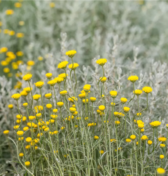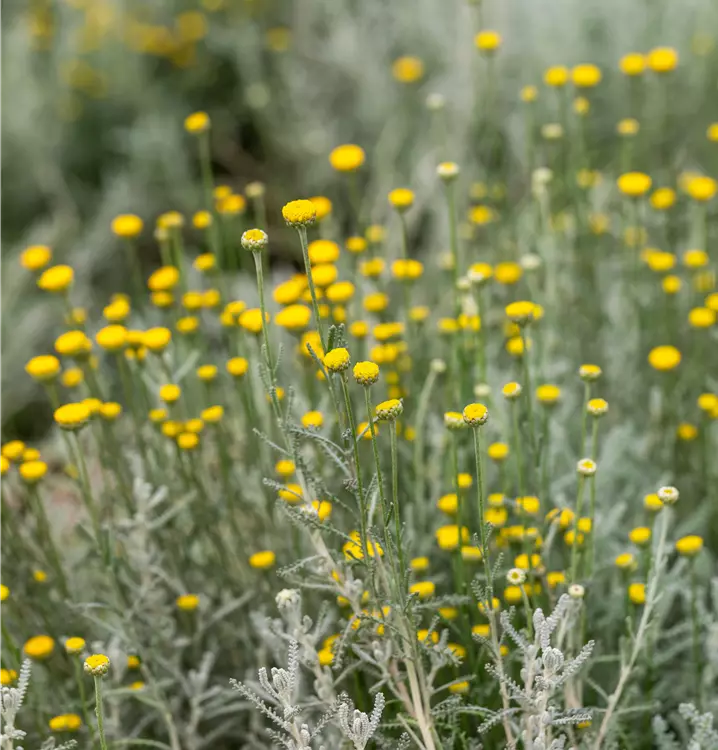Santolina chamaecyparissus bildet ballförmige, gelbe Blüten ab Juli.