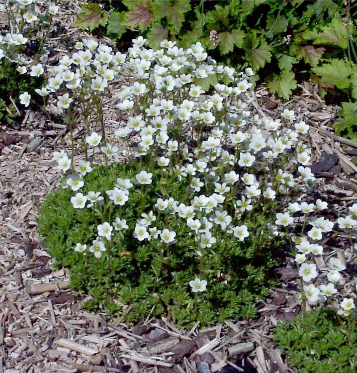 Saxifraga x arendsii 'Schneeteppich' bildet schalenförmige, weiße Blüten ab April.