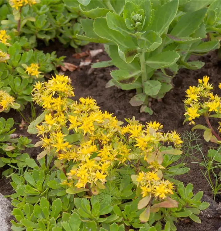 Sedum hybridum 'Immergrünchen' bildet in Dolden angeordnete, gelbe Blüten ab Juni.